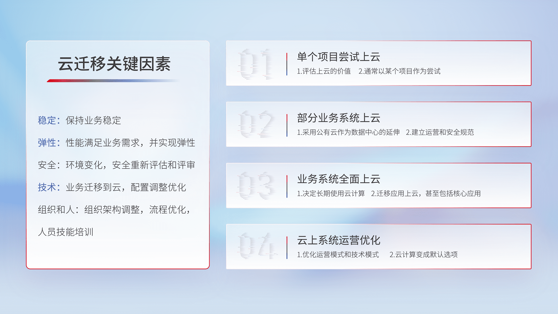 结合实际业务,,,从规划设计、、、、云平台选型、、云原生改造、、数据迁移、、、集成交付,,,迁移全过程为客户识别最佳上云路径,,,,做好风险识别管理,,,,设计网络架构、、、、身份权限、、、、安全审计合规、、、、操作审计、、、、日志审计、、、、监控告警策略、、多站点容灾设计等,,对云上基础设施进行整体规划,,,提升IT治理水平,,,,以满足弹性、、高可用、、高性能的需求。。。。