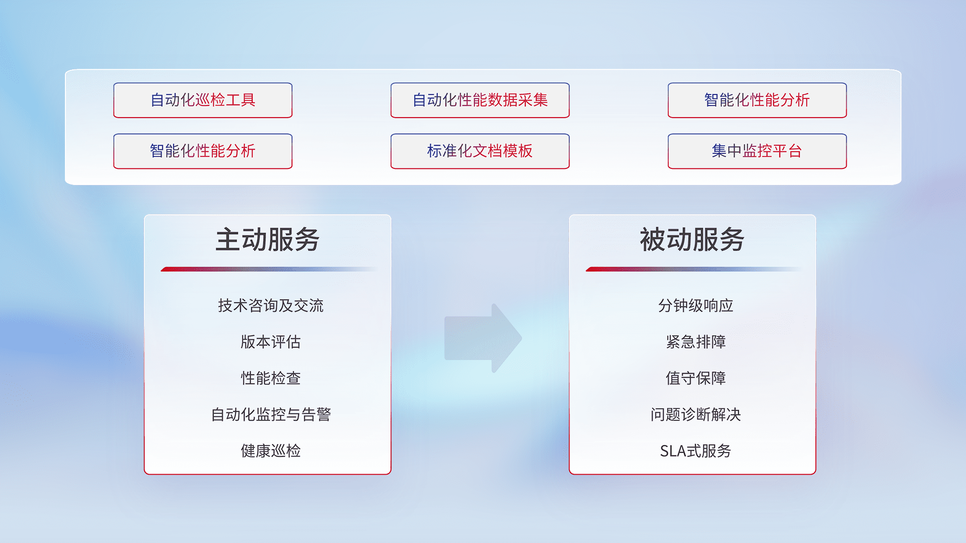 智能化工具和标准化文档,,,,保障服务质量,,,,提供主动服务(包含技术咨询、、、、版本评估、、、、性能检查、、自动化监控与告警、、健康巡检)和被动服务包含(分钟级响应、、、紧急排障、、、值守保障、、、问题诊断解决、、SLA服务)。。。