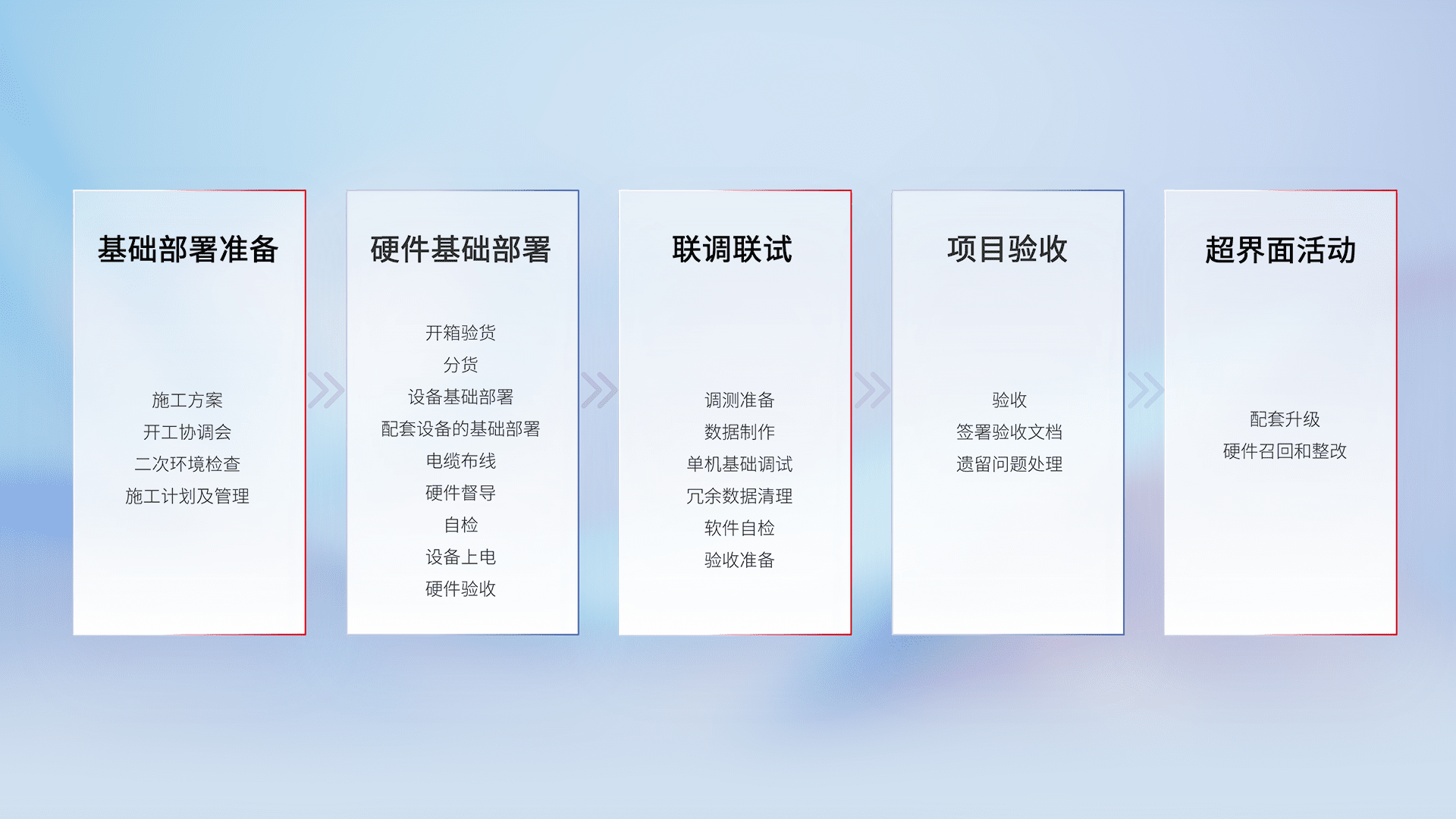 从基础部署准备、、、、硬件基础部署、、、、联调联试、、项目验收、、、、越界面活动的全过程可追溯,,,,保证施工质量和进度。。。。